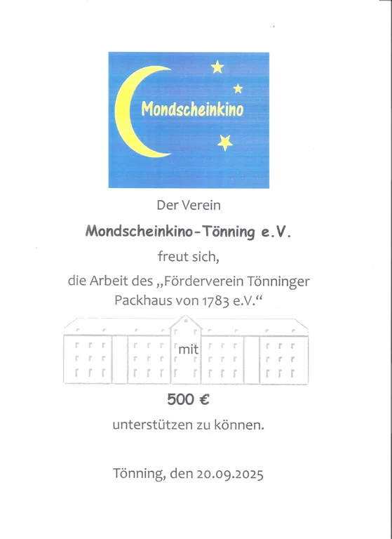 Am 20.09.2025 wurde uns wie jedes Jahr eine Spende vom Verein "Mondscheinkino-Tönning e.V. übergeben. Auf diesem Weg möchten wir uns für die grosszügige Spende von 500,00 € bedanken.😂